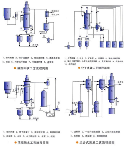 薄膜蒸發器可用作物料的濃縮、脫氣、脫溶(溶劑回收)、提純等化工單元操作、下列流程可供參考: